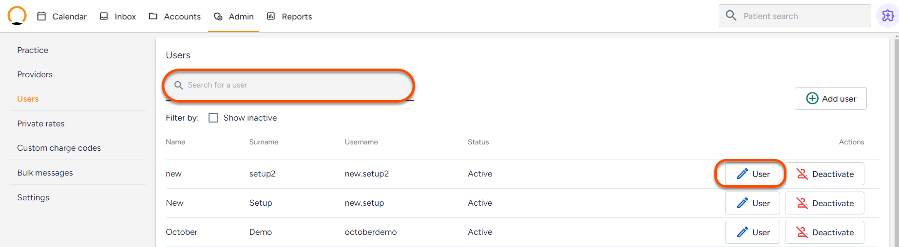 Search for the user you would like to reset the password for then click on the 'User' button to edit the user's account.