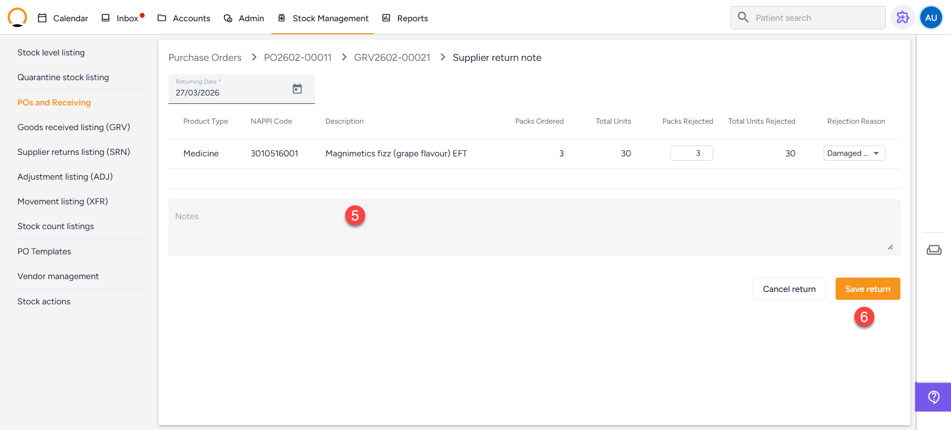 The Supplier Return Note (SRN) is a crucial tool for managing and tracking items that must be sent back to a vendor. It provides a digital audit trail for all stock leaving your practice, typically due to issues like damage, expiration, or incorrect delivery.