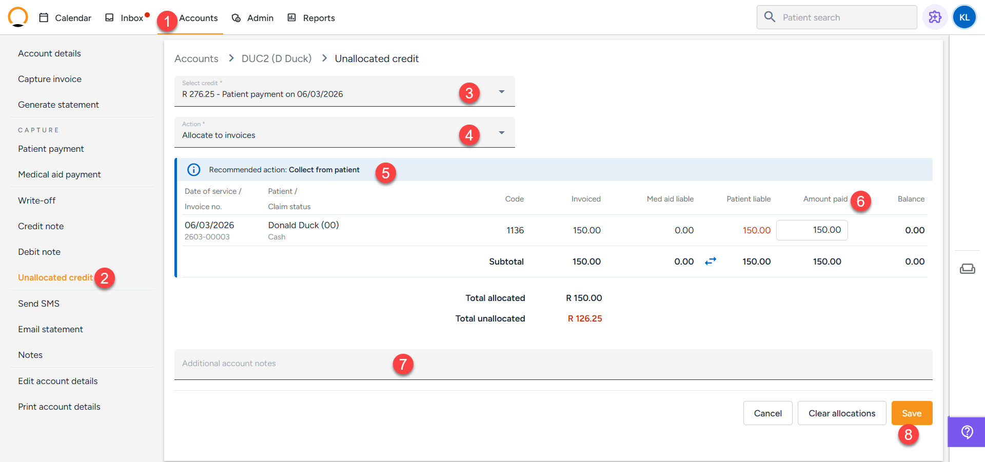 An unallocated credit refers to a payment recorded on a patient’s account that has not yet been matched or applied to a specific invoice. In essence, it represents funds received by the practice that remain on the account without an associated charge. These amounts are displayed under the "Unallocated Credit" section within the balances area of the patient’s Account Details.